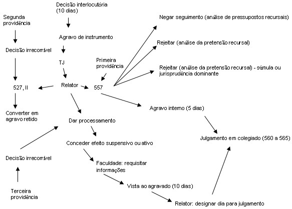 Da observação do fluxograma acima estabelecido e da redação do caput do artigo 527 do CPC, temos que recebido o agravo de instrumento no tribunal, deve-se proceder à sua imediata distribuição, mediante sorteio, a um desembargador-relator sorteado, o qual: ü Negar-lhe-á seguimento, liminarmente, nos seguintes casos: se o recurso for manifestamente inadmissível, for improcedente, estiver prejudicado ou estiver em confronto com súmula ou com jurisprudência dominante do respectivo tribunal, do STF, ou de Tribunal Superior. A posição predominante na doutrina é de que o inciso I, do artigo 527, do CPC, apenas remete ao caput do artigo 557 do CPC; minoritários aqueles que argúem que o referido inciso remete, também, ao parágrafo 1º-A do artigo 557 do CPC: posição, a priori, insustentável, haja vista que não será negado seguimento ao agravo de instrumento, e sim dado seguimento, de forma que seria uma hipótese que não se encontra prevista no artigo 527, I; a posteriori, a posição é sustentável, mas com fulcro no artigo 527, III, do CPC. Assim, para efeitos do artigo 527, I, o desembargador-relator pode inadmitir o recurso de agravo de instrumento. ü É obrigado (poder-dever) a converter o agravo de instrumento em agravo retido, nos casos em que não couber agravo de instrumento e este tiver sido a via recursal utilizada. Assim, procedida a conversão, os autos serão remetidos ao juízo a quo, de forma que se retenha o agravo aos autos e que se espere pela sentença e posterior reconhecimento de possível apelação. ü Reconhecerá do agravo de instrumento, desde que reconhecida a possibilidade de causar-se à parte lesão grave e de difícil reparação, atribuindo-lhe, somente nesse caso, efeito suspensivo. O artigo 558 do CPC deve ser observado: o desembargador-relator atribuirá o efeito suspensivo se comprovada a urgência e se requerido pelo agravante, sendo relevante uma fundamentação do pedido, de forma que, só assim, o cumprimento da decisão será suspenso até que ocorra o pronunciamento definitivo da Câmara Civil. ü Caso ache necessário, poderá requisitar informações ao juiz da causa, o qual as prestará no prazo de dez dias. As informações requisitadas não podem ser genéricas, de maneira que o desembargador-relator as determine; além disso, o juiz da causa deve se limitar à emissão de juízo de fato (narrativa) sobre as informações pedidas. Note que os três primeiros pontos são auto-excludentes: nega-se seguimento ao agravo de instrumento, transforma-se-o em agravo retido ou reconhece-se-o. O quarto ponto traz uma possibilidade aplicável em concomitância aos três primeiros pontos. Na mesma oportunidade em que decide pelo seguimento, ou não, ou pela conversão do agravo de instrumento, o desembargador-relator mandará intimar o agravado, na pessoa de seu advogado, para que responda, no prazo de dez dias, facultando-lhe a juntada de quaisquer documentos, mesmo que não constantes dos autos do processo principal. Tal resposta são as contra-razões ao agravo, e nestas é que ele deverá argüir e provar, se existente, a não-comunicação da interposição do agravo pelo agravante, sob pena de preclusão. Depois de ultimadas as providências de reconhecimento do agravo de instrumento, requisição de informações e intimação do agravado, o desembargador-relator mandará ouvir o órgão do Ministério Público, se for o caso, para que se pronuncie no prazo de dez dias. Em seguida, em prazo não superior a trinta dias da intimação do agravado, o desembargador-relator designará data para o julgamento em colegiado do agravo. Na sessão de julgamento, depois de o desembargador-relator ter feito exposição da causa, a Câmara Cível julgará (mediante sustentação oral) e, ao depois, o desembargador-relator proferirá o seu voto e, em seguida, os outros dois desembargadores votam. Note que o artigo 529 (CPC) prevê que se o juízo a quo reconsiderar (proferir juízo positivo de retratação), antes do julgamento do recurso pelo tribunal, a sua decisão, o julgamento do agravo de instrumento no juízo ad quem faz com que o agravo reste prejudicado. Assim, o desembargador-relator deverá negar seguimento ao agravo (artigo 527, I, CPC), decisão esta recorrível mediante agravo interno interposto junto à Câmara Cível respectiva. Atente-se para os recursos cabíveis contra a decisão do desembargador-relator. No caso de este negar seguimento, liminarmente, ao recurso de agravo, cabe o agravo interno para a Câmara Civil respectiva, no prazo de cinco dias. Na hipótese da conversão do ou de conhecer-se seguimento ao recurso, a decisão do desembargador-relator é irrecorrível – irrecorribilidade essa questionável, haja vista que os causídicos, na impossibilidade de aplicarem um recurso processual, fazem uso do remédio constitucional permitido pelo mandado de segurança, o qual é muito mais demorado, trabalhoso e custoso. REFERÊNCIAS ARRUDA ALVIM WAMBIER, Teresa Celina. Os agravos no CPC brasileiro. 4ª ed. São Paulo: Revista dos Tribunais, 2006. BARBOSA MOREIRA, José Carlos. Comentários ao código de processo civil: volume V: arts. 476 a 565. 13ª ed. Rio de Janeiro: Forense, 2006. CÂMARA, Alexandre Freitas. Lições de direito processual civil, volume II. 13ª ed. Rio de Janeiro: Lúmen Júris, 2006. CARVALHO, Fabiano. A conversão do agravo de instrumento em agravo retido na reforma do Código de Processo Civil. Jus Navigandi, Teresina, ano 8, n. 428, 8 set. 2004. Disponível em: <http://jus2.uol.com.br/doutrina/texto.asp?id=5660>. Acesso em: 09 nov. 2006. CHEIM JORGE, Flávio. A nova reforma processual. 2ª ed. São Paulo: Saraiva, 2003. DIDIER JÚNIOR, Fredie; CUNHA, Leonardo José Carneiro da. Curso de Direito processual civil: volume 3: meios de impugnação às decisões judiciais e processo nos tribunais. 3ª ed. Salvador: JusPodivm, 2007. GRINOVER, Ada Pellegrini; FERNANDES, Antonio Scarance; GOMES FILHO, An